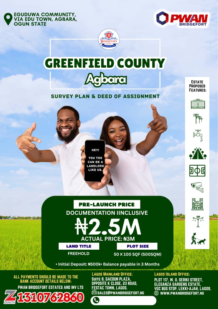 Looking for the perfect place to build your dream home or invest in farmland? Greenfield County in Edu, Agbara, Ogun offers an unbeatable opportunity to own prime real estate with just ₦500K initial deposit!